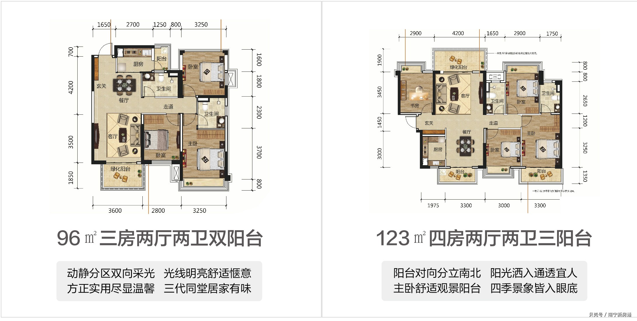 目前高层住宅C2#在售,呈两梯四户,含96-123㎡的三至四居室,能满足刚需、改善的不同居住需求。C2#由两单元构成,其中1单元层高33层,2单元 18层,带装修参考均价为12000元/㎡。