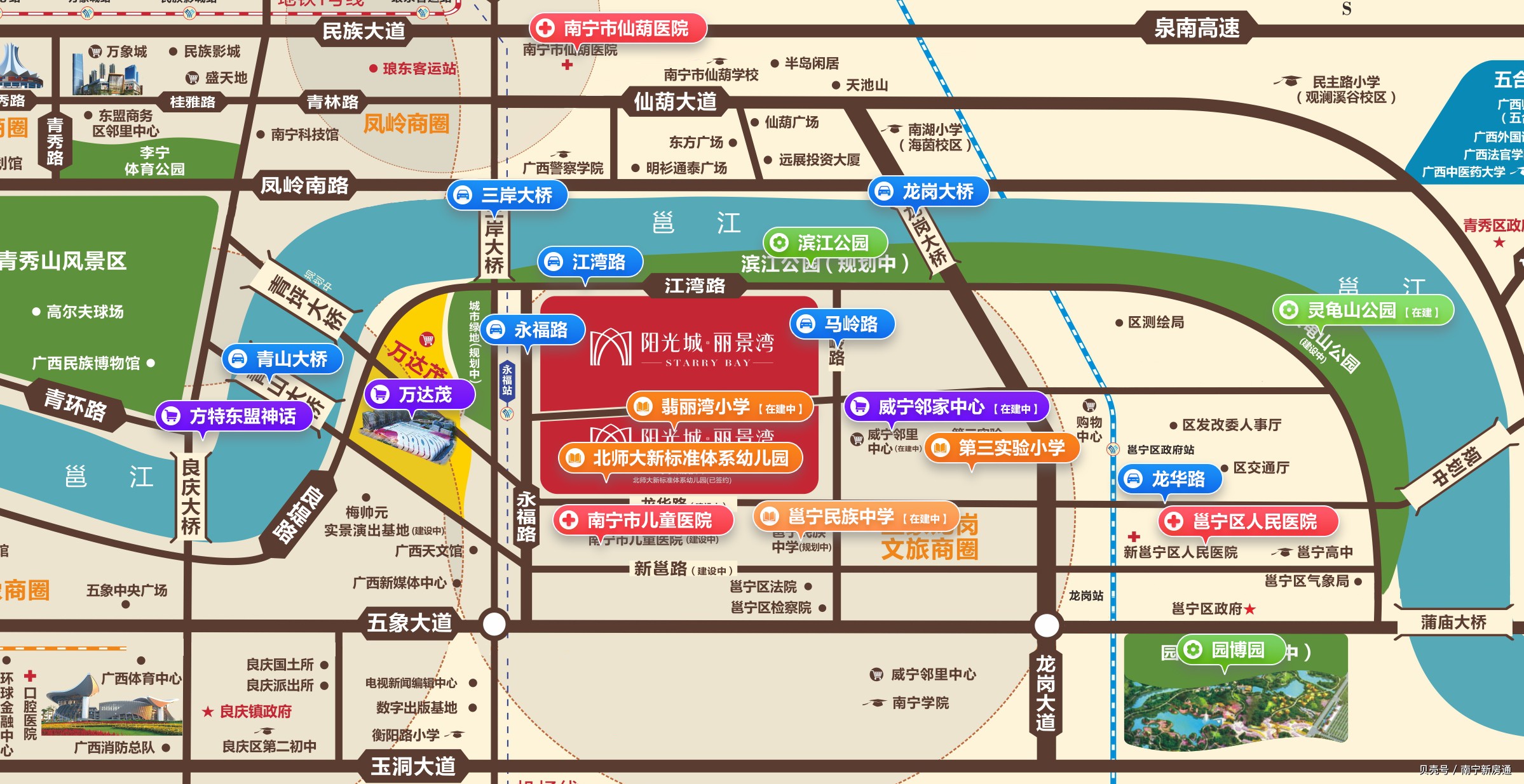 阳光城·丽景湾位于五象新区龙岗片区内,紧靠邕江南岸。项目地面路网健全,成井字分布,自驾出行便捷。周边校舍林立,书香味浓;市儿童医院、邻家广场等配套环绕,看病就诊、休闲消费便利。