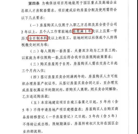 招拍挂文件规定,房屋购买人仅限于入职华为总部及其全资子公司2年以上,且个人常驻地在东莞满1年及以上且第一学历为全日制本科及以上的员工。