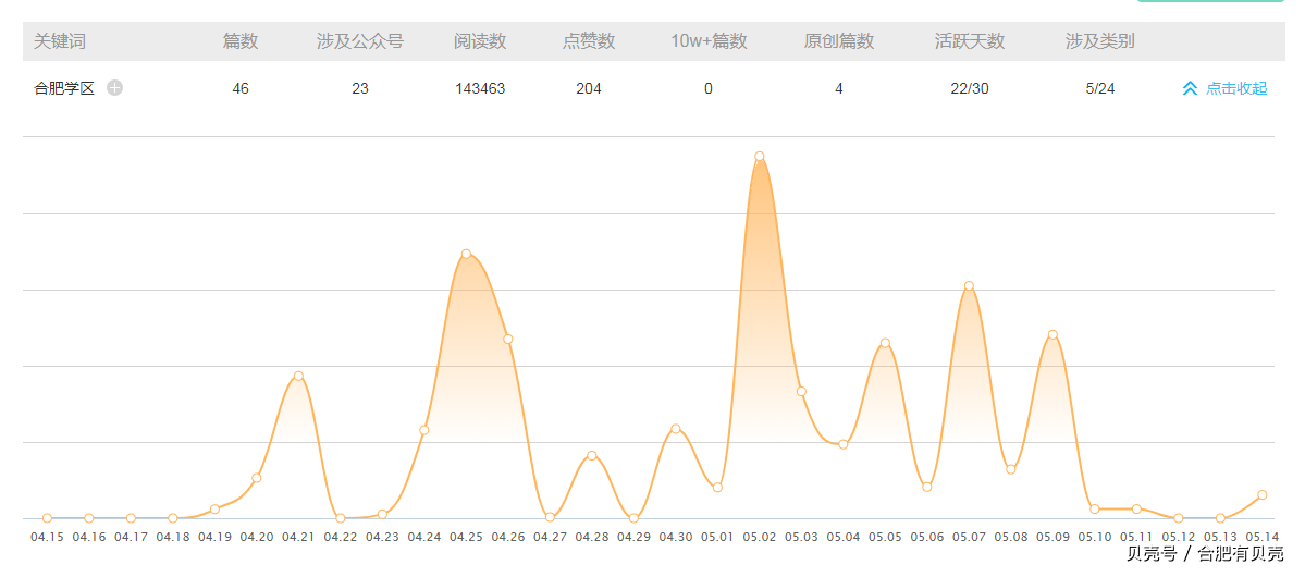 从上图中我们也可以看出,今年的3-4月份,三孝口商圈的房价起伏更大,成交均价上涨幅度比2018年更大。根据下图新榜指数可以发现,近1个月,关键词“合肥学区”出现次数明显提高,预计在6月初学区正式公布之后,“学区”将再一次吸引网友大量关注。