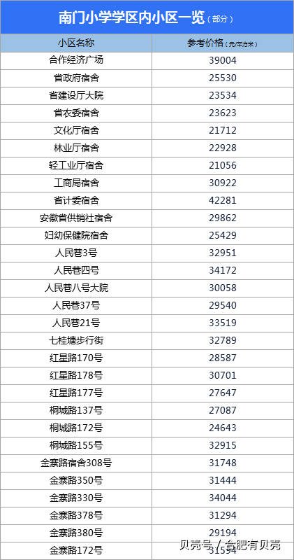 西边组合内有合作经济广场、省计委宿舍、环城南路56号、金寨路330号等,大部分小区均价在3万以上,特别是合作经济广场,作为南门小学一堆“老破小”中唯一的现代化小区,自带电梯和车位,稳稳占据合肥学区房“C”位,个别房源成交价达5万/平也就可以理解。