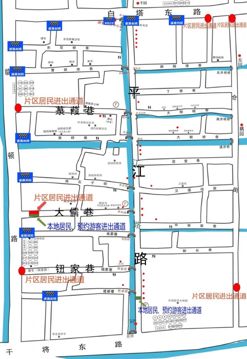 平江路景区:本地居民、外地游客须从平江路南入口(游客中心门前)、大儒巷(姑苏区少年宫大儒巷分部门前)进出。每天20:00后,平江路南入口将完全封闭。